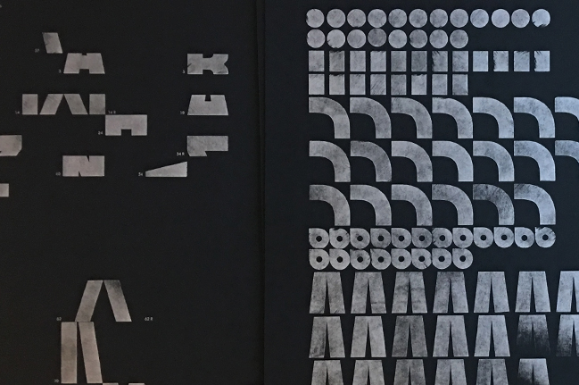 Détail de l’inventaire imprimé avec de l’encre argent sur papier noir.