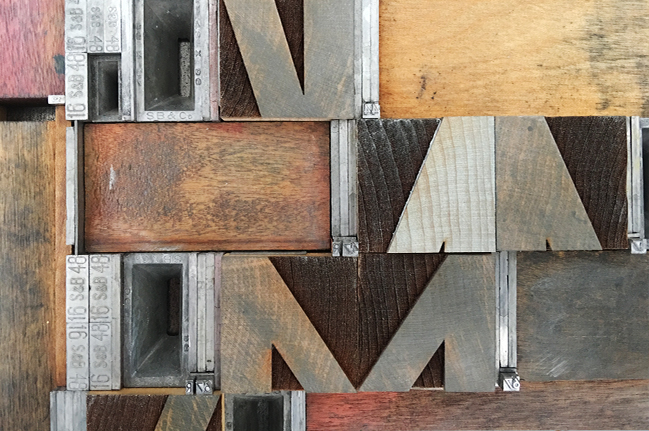 Composition avec chiffres en plomb et blocs de bois.