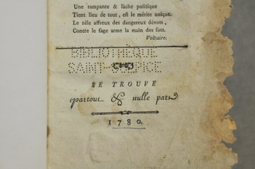 Les dons sont d’ailleurs souvent écrits dans des notices sur la page de garde (ex-dono) spécifiant les noms de l’ancien et du nouveau propriétaire du livre. D’autres ex-libris se veulent des instructions sous forme de poème quant à la façon de prêter l’ouvrage, ou encore des menaces adressées à une personne qui volerait le livre. C’est cependant l’acharnement à effacer les marques laissées par les anciens propriétaires du livre qui nous a surpris. Souvent, les signatures ont été rayées ou encore découpées sur la page de garde, et les super libris ont été grattés, ce qui empêche de retracer la provenance du livre.