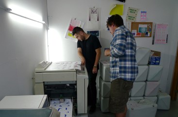 Afin de mieux comprendre les particularités du risographe, en lien avec notre projet sur la lisibilité, nous avons rencontré Alexis Coutu-Marion, membre de l’atelier d’expérimentation visuelle Charmant & Courtois. Il nous a expliqué le fonctionnement de cette technique d’impression, qui est aussi rapide qu’un photocopieur et peu coûteuse pour des tirages moyens (entre 100 et 1000 copies). Le principe du duplicopieur est d’imprimer une seule couleur à la fois. Dans le cas d’une image possédant différentes couleurs, on doit procéder à plus d’un passage de la feuille. Le repérage est difficile, mais le léger décalage des couleurs offre des effets visuels intéressants.