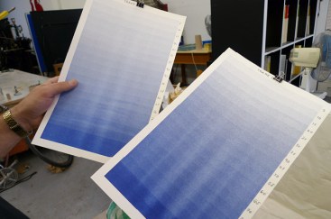 Nous avons effectué des tests à partir des planches de Guillaume Lépine pour observer la différence de rendu avec divers types de papiers que nous avions apportés. Nous avons notamment essayé des finis lisse et vélin, plusieurs tons de blanc et une large gamme d’épaisseurs, allant de la feuille ultramince à cartonnée. Dans le cas du papier très mince, l’impression recto-verso laissait transparaître l’encre de l’autre côté, mais les superpositions de couleurs ont donné des résultats très réussis.