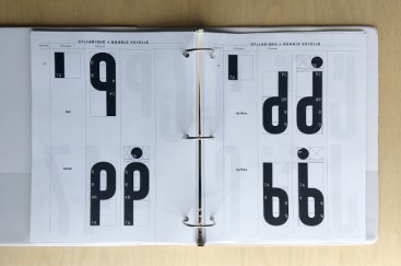 Les deux designers ont pu poser des questions sur certains signes à Thomassie concernant les doubles voyelles. Ainsi, les 14 signes de la rangée des « ai » du syllabaire ne sont jamais ponctués par un point diacritique annonçant une double voyelle, alors que ceux des rangées « i », « u » et « a » le sont. Thomassie a également pu nous confirmer quels signes diacritiques sont utilisés au Nunavik et donner son aval à certains signes plus stylisés, dont celui représentant le son « ngng », qu’il trouvait esthétiquement intéressant et tout à fait lisible.