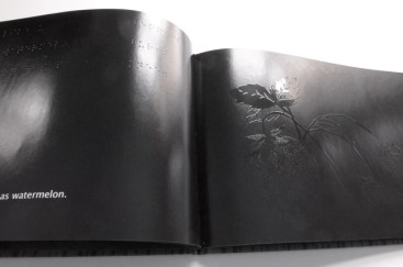 Ayant entamé avec Julien Hébert le design du projet, nous avons envisagé deux formes différentes que pourrait prendre l’ouvrage. L’une serait un bloc de papier relié, qui prendrait les mêmes dimensions que la tablette Kindle (4,5 x 6,5 pouces), en référence au livre électronique le plus populaire sur le marché. Quant à la structure de navigation, au départ, l’idée était de s’y orienter à l’aide de trous de pouce, ce qui renvoie aux codes de l’encyclopédie. Dans la même veine, Stéfanie Vermeesh, qui a travaillé à ce projet l’automne dernier, explorait aussi l’idée d’imprimer de l’information sur la tranche du livre ou de plier le coin supérieur droit de la couverture, un geste qui rappelle les habitudes de lecture et l’icône d’un fichier texte.